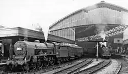 Trains on the Bristol and South Wales Union and the Midland routes operated from the terminal platforms, while the GWR used the new through platforms.[6] The capital costs of the new work were split 4/14 GWR/B&ER and 10/14 MR, and operating costs were split GWR 3/8, MR 3/8 and B&ER 2/8. Hence, when the GWR absorbed the B&ER in 1876 the split became GWR 5/8 and MR (later LMS) 3/8, until nationalisation on 1 January 1948.[15]