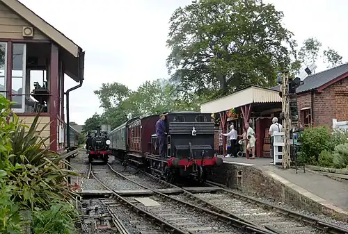 When the railway line first opened in 1900, Rolvenden Station was known as "Tenterden". Its name was changed when the line extended north three years later and a station closer to Tenterden was constructed. The new Tenterden Town station opened on 16 March 1903.[1] The line closed for regular passenger services on 4 January 1954[1][2] and all traffic in 1961. It reopened on 3 February 1974[1] under the aegis of the Tenterden Railway Company which bought the line between Tenterden and Bodiam. The station now houses the KESR's Carriage and Wagon works, and the Colonel Stephens Museum is located nearby.