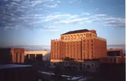 The first Terre Haute House was built by Terre Hautean, Chauncey Rose, who called it "The Prairie House" because it was located "in the prairie" several blocks east of the village.[1] Rose operated the original hotel from 1838 to 1841. When federal funding for continued construction of the National Road dried up in 1840, and the U.S. Army Corps of Engineers, who supervised construction of the highway, departed the community, the hotel was closed. In the meantime, historical information seems to indicate that the hotel was turned into a boarding house.