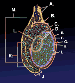 Animation of the migration of spermatozoa from their origin as germ cells to their exit from the vas deferens. A) Blood vessels; B) Head of epididymis; C) Efferent ductules; D) Seminiferous tubules; E) Parietal lamina of tunica vaginalis; F) Visceral lamina of tunica vaginalis; G) Cavity of tunica vaginalis; H) Tunica albuginea; I) Lobule of testis; J) Tail of epididymis; K) Body of epididymis; L) Mediastinum testis; M) Vas deferens.