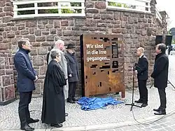 The 'Dejudaization Institute' Memorial (German: Mahnmal zum „Entjudungsinstitut“) is a memorial installation erected in Eisenach at the behest of eight Protestant regional churches. The memorial remembers the Protestant regional churches' culpability for the antisemitic Institute for the Study and Eradication of Jewish Influence on German Church Life they founded, which was active between 1939 and 1945 in the Nazi era. The memorial installation is intended to be understood as the Protestant churches' confession of guilt and as a memorial to the victims of the church's anti-Judaism and antisemitism. It was unveiled on May 6, 2019, eighty years after the founding of the "Dejudaization Institute".[1]