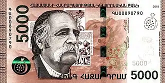 The Central Bank of Armenia issued a 10,000 Dram coin (100th Birth anniversary of novelist William Saroyan) in 2008[36] and a 5,000 Dram banknote in 2018.[37]
