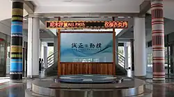 Gao Shan Jing Xing (Chinese: 高山景行) Excellency was designed by artists Pei Ze Chen (Chinese: 陳培澤) and Fang Shi Lin (Chinese: 林芳仕). It was completed and unveiled after the school was rebuilt in 2006. It is located in the campus atrium. Because the school is located above the Damalin ruins,[39] it uses granite, steel and colored glaze as materials. The steel is coated with colored glaze to form a mountain shape, and the various colors of colored glaze are used to express the various cultural layers of the Tamalin archaeological site. It commemorates the pioneers' reclamation. There is a granite humanoid next to it, represents the literati.[40][41]