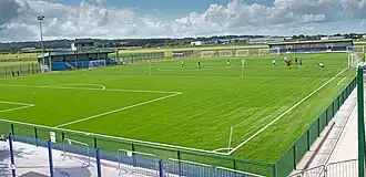 The Airfield is noted in Welsh football for having retractable floodlights due to the ground being located close to a working runway at Hawarden Airport.[3] Steve Williams, chairman of the Football Association of Wales, stated that he wanted the Wales national football teams to play more international matches in north Wales. The Airfield was suggested as a location for friendlies. The Airfield, however, does not meet UEFA standards, meaning the only international ground in north Wales is the Racecourse Ground in Wrexham.[4] Due to failing to meet UEFA standards, Airbus UK Broughton also have to play their home UEFA competition matches away from The Airfield.[5]