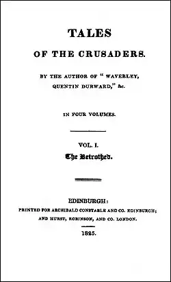 The first edition was published as part of Tales of the Crusaders in Edinburgh by Archibald Constable and Co. on 22 June 1825. It was advertised for publication by Hurst, Robinson, and Co. in London on the same date, but apparently not issued until 11 July. The price was two guineas (£2 2s or £2.10).[3] As with all of the Waverley novels until 1827 publication was anonymous. There is no conclusive evidence that Scott returned to The Betrothed until the spring of 1831 when he revised the text and provided an introduction and notes for the 'Magnum' edition, in which it appeared as Volume 37 in June 1832.[4]