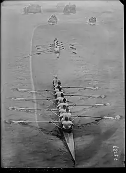 According to Oxford's bow, George Drinkwater, Cambridge were "rowing well within themselves" and passed the finishing post four and a half lengths ahead in a time of 19 minutes 27 seconds.[14] It was their fourth consecutive victory, the largest winning margin since the 1914 race and the fastest winning time since the 1911 race. The win took the overall record in the event to 39–34 in Oxford's favour.[5]