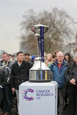 For the sixth year, the men's race was sponsored by BNY Mellon while the women's race had BNY Mellon's subsidiary Newton Investment Management as sponsors.[9] In January 2016, it was announced that the sponsors would be donating the title sponsorship to Cancer Research UK and that the 2016 event onwards would be retitled "The Cancer Research UK Boat Races".[10] There is no monetary award for winning the race, as the journalist Roger Alton notes: "It's the last great amateur event: seven months of pain for no prize money".[11]