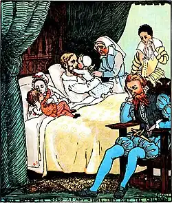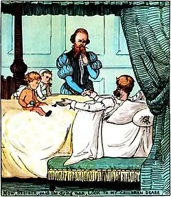 The tale has been reworked in many forms; it frequently appears attributed as a Mother Goose rhyme. Around 1840, Richard Barham included a spoof of the story in his Ingoldsby Legends, under the title of The Babes in the Wood; or, the Norfolk Tragedy.[2] Harris cheekily claims in an endnote[2] that the true history of the children is, 'or ought to be,' in "Bloomfield's [sic] History of Norfolk", but that work's Wayland section does not mention it. The anonymous ballad was also illustrated by Randolph Caldecott in a book published in London in 1879.
