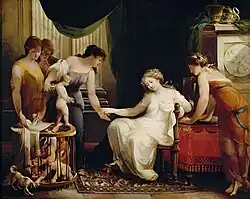Three years later, Vien's pupil Jacques Gamelin also treated the subject, borrowing his fluted pilasters but also modifying it even more by adding two more women and (uniquely) showing the matrona handing the trader some coins.