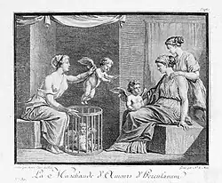 Another of Vien's students, Jacques Louis David, produced a mirror-image drawing of the original fresco whilst in Rome in 1776. Noël Lemire used that drawing as the basis for a copperlate engraving which appeared in Jean Claude Richard de Saint-Non's two-volume 1782 Voyage pittoresque ou description des Royaumes de Naples et de Sicile (A Picturesque Journey or Description of the Kingdoms of Naples and Sicily).[2] In that work the copperplate is entitled The Cupid Seller of Herculaneum, showing that the fresco's actual findsite had already been forgotten. David and Lemire were largely faithful to the original fresco, but the figures are closer to each other, and the seller lasciviously shows her breasts, whilst the sharp contours and dark shadows match contemporary French taste.