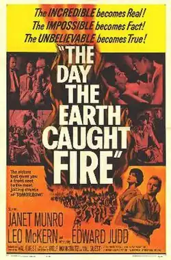 The Day the Earth Caught Fire is a 1961 British science-fiction disaster film directed by Val Guest and starring Edward Judd, Leo McKern, and Janet Munro.[4] It is one of the classic apocalyptic films of its era.[5][6][7] The film opened at the Odeon Marble Arch in London on 23 November 1961. In August 2014, a restored version was screened at the British Museum's summer open-air cinema.[8]