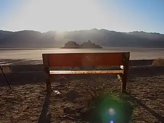 The Grandstand is located in the northwest corner of Racetrack Playa and is the only feature, other than small scattered rocks and a dolomite outcrop on the northernmost shore, that interrupt the playa. The southernmost of the two rock mounds that compose The Grandstand is the tallest, by a few feet. It rises approximately 20-metre (66 ft) above the very flat surface of the playa, whose north end is only 1.5-inch (3.8 cm) higher than the southern end. Racetrack Playa is at an elevation of 3,714 feet (1,132 m)[2] above sea level, and is 2.8-mile (4.5 km) long (north-south), and 1.3-mile (2.1 km) wide (east-west).