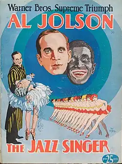 According to performer Eddie Cantor, as negotiations between Warner Bros. and Jessel floundered, Jack L. Warner and the studio's production chief, Darryl Zanuck, called to see if he was interested in the part. Cantor, a friend of Jessel's, responded that he was sure any differences with the actor could be worked out and offered his assistance.[12] Cantor was not invited to participate in the Jessel talks; instead, the role was then offered to Jolson, who had inspired it in the first place. Describing Jolson as the production's best choice for its star, film historian Donald Crafton wrote, "The entertainer, who sang jazzed-up minstrel numbers in blackface, was at the height of his phenomenal popularity. Anticipating the later stardom of crooners and rock stars, Jolson electrified audiences with the vitality and sex appeal of his songs and gestures, which owed much to black american sources."[13] As described by film historian Robert L. Carringer, "Jessel was a vaudeville comedian and master of ceremonies with one successful play and one modestly successful film to his credit. Jolson was a superstar."[14] Jolson took the part, signing a $75,000 contract on May 26, 1927, for eight weeks of services beginning in July.[15] There have been several claims but no proof that Jolson invested some of his own money in the film.[16] Jessel and Jolson, also friends, did not speak for some time after—on the one hand, Jessel had been confiding his problems with the Warners to Jolson; on the other, Jolson had signed with them without telling Jessel of his plans. In his autobiography, Jessel wrote that, in the end, Jolson "must not be blamed, as the Warners had definitely decided that I was out."[17]