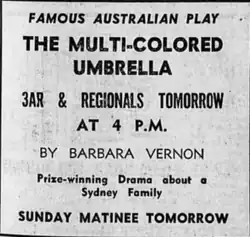The Multi-Coloured Umbrella is a 1957 Australian stage play written by Barbara Vernon. It was produced professionally, was adapted for television and radio, and inspired two prequels.[1]