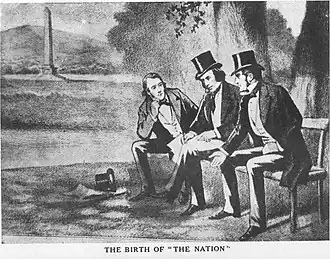 The founders of The Nation were three young men – two Catholics and one Protestant – who, according to the historian of the newspaper T. F. O'Sullivan, were all "free from the slightest taint of bigotry, and were anxious to unite all creeds and classes for the country's welfare.".[2] They were Charles Gavan Duffy, its first editor; Thomas Davis, and John Blake Dillon.[2] All three were members of Daniel O'Connell's Repeal Association, which sought repeal of the 1800 Act of Union between Ireland and Britain; this association would later be known as Young Ireland. The name suggested by Duffy for the paper was The National, but Davis disagreed, suggesting "that the use of an adjective for such a purpose was contrary to the analogies of the English language". He suggested The Nation, which was assented to by all three.[3] "We desired to make Ireland a nation", Duffy wrote, "and the name would be a fitting prelude to the attempt.".[3] In due course and after many other consultations between the founders, the following announcement was made as to the date of publication, the name of the journal, and the contributors:.[4]