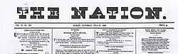 The Nation was an Irish nationalist weekly newspaper, published in the 19th century. The Nation was printed first at 12 Trinity Street, Dublin from 15 October 1842 until 6 January 1844. The paper was afterwards published at 4 D'Olier Street from 13 July 1844, to 28 July 1848, when the issue for the following day was seized and the paper suppressed. It was published again in Middle Abbey Street on its revival in September 1849[1] until 1900, when it merged with the Irish Weekly Independent.