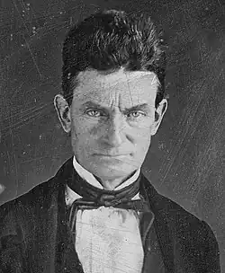 In 2014, Chicopee city historian Stephen Jendrysik submitted the theory that the figure was a surreptitious portrait of the militant abolitionist John Brown, who was also a direct descendant of Deacon Chapin and a devout Calvinist.[12][13] Brown was a leading militant figure in the escalating tensions between North and South which lead to the American Civil War, and it was in Springfield that Brown first organized the militant Underground Railroad movement, the Subterranean Pass Way with Frederick Douglass and Harriet Tubman.[14][15] Chester Chapin's business associate Ethan S. Chapin[16] owned the Massasoit Hotel, which acted as a safe house for escaped slaves to hide beneath its staircase, and Brown's lodging prior to his move to the city in the 1840s.[17] Chester Chapin had been a War Democrat himself, paying for the uniforms of 10th Regiment at the start of the Civil War.[18] In John Brown, Abolitionist (2005), historian David S. Reynolds refers to Brown as "The Puritan", as Brown often cited the inspiration of figures such as Jonathan Edwards and Oliver Cromwell.[19][20] Puritan beliefs strongly influenced the abolitionist movement, and were condemned by divines of the South for their antinomian individualism and rebeliousness.[19] The anti-war congressman Samuel S. Cox considered that "[a]bolition is the offspring of Puritanism [which] introduced the moral elements involved in slavery into politics."[21]