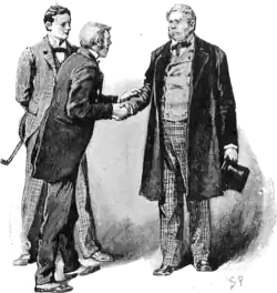 Duncan Ross shakes Jabez Wilson's hand with Vincent Spaulding looking on, 1891 illustration by Sidney Paget