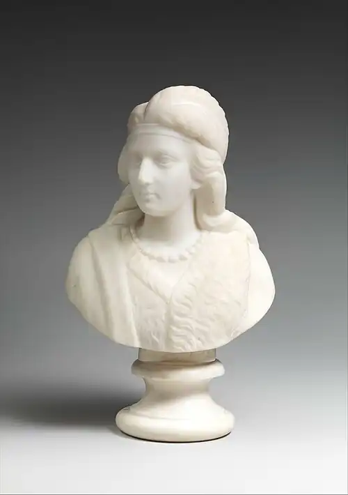 Numerous artists responded to the epic. The earliest pieces of sculpture were by Edmonia Lewis, whose father was Haitian and her mother Native American and African American. The arrow-maker and his daughter, later called The Wooing of Hiawatha, was modeled in 1866 and carved in 1872.[59] In 1872 Lewis carved The Marriage of Hiawatha in marble, a work purchased in 2010 by the Kalamazoo Institute of Arts.[60] Lewis's Hiawatha works remain notable not just because of her talented execution, but because of the rare insight within the pieces that comes from the artist being of Native American descent. Other 19th century sculptors inspired by the epic were Augustus Saint-Gaudens, whose marble statue of the seated Hiawatha (1874) is held by the Metropolitan Museum of Art;[61] and Jacob Fjelde, who created a bronze statue, Hiawatha carrying Minnehaha, for the Columbian Exposition in 1893. It was installed in Minnehaha Park, Minneapolis, in 1912 (illustrated at the head of this article).