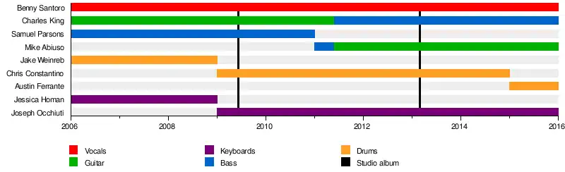 In April 2011, bassist Sam Parsons announced he would be leaving the band after finishing the "I Have Made Fire!" tour with Set It Off and Lacerda.[12] He was then replaced by Mike Abiuso, a former member of the bands Kiss Kiss and The Gay Blades. Mike met the band after Kiss Kiss and The Venetia Fair toured together on the 2010 "Prankcalls and Snowballs" tour.[13]
