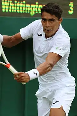 Before attempting to qualify for his second Grand Slam, Monteiro played at the Internationaux de Tennis de Blois but withdrew from the second round match against Miljan Zekić, citing a back injury.[50] At the Wimbledon Championships qualifying, Thiago was eliminated again in the first round, this time to Julian Reister.[51] To improve his position in the ATP rankings, Thiago attempted and qualified for the German Open main draw. The Brazilian won three matches against three Germans players (two in the qualifiers, and Mischa Zverev in the main draw),[52] to set a third match against Pablo Cuevas. Cuevas delivered Monteiro's third loss in the ATP World Tour,[53] but this time he did not win the tournament, being runner-up instead. Thiago qualified for a consecutive World Tour appearance this time at Swiss Open Gstaad. Monteiro was defeated by Robin Haase in the third round. The Brazilian defeated Antoine Bellier in the first round and the second seed, and top 30 Gilles Simon in the second round.[54]