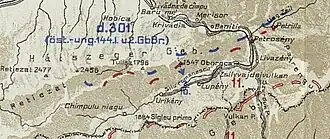 Much to Falkenhayn's relief, von Busse's forces attacked west of Petrozsény on 30 September.[18] On 1 October, the Romanian forces held a line extending from west of Mount Tulișa to Mount Oboroca - running north of Hobicaurikány (Uricani) and Kimpulunyág (Câmpu lui Neag), Lupény (Lupeni) and Zsilyvajdejvulkán (Vulcan) - then continuing northeast through Petrozsény and Petrilla (Petrila).[19] The Austro-Hungarian 144th Brigade fought at Petrilla at the beginning of October.[20] On 1 October, the Germans reached Petrozsény.[21] The fighting for Petrozsény itself took place between 1 and 3 October.[22] The official Austro-Hungarian communique of 2 October announced the seizure of Mount Oboroca. However, it was only on 3 October that a Romanian communique acknowledged the loss of Mount Oboroca to Austro-Hungarian troops. The Romanian communique appears to be the correct one, given that post-war Austrian sources state that the fighting for Oboroca took place on 3 October. The Austro-Hungarian unit involved was the 2nd Mountain Brigade.[23][24] The Romanian communique of 4 October announced the Romanian withdrawal from the region, but not before destroying Petrozsény's coal mines.[25] The battle ended on 5 October, with both Petrozsény and the Szurdok Pass being recaptured by the Central Powers.[26]