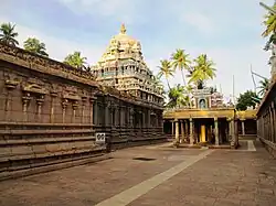 A granite wall surrounds the temple, enclosing all its shrines and three of its four bodies of water. The temple has a five-tiered rajagopuram, the temple's gateway tower and a huge temple tank in front of it. The temple is believed to have been built by the Pandyas, with later additions from the Madurai Nayaks.
