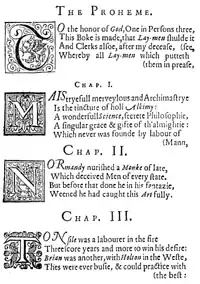 From the first word of the Proeme, and the Initiall letters of the six following Chapters [...] we may collect the authors Name and place of Residence: For those letters, (together with the first line of the seventh Chapter) speak thus [...].[10]