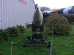 A Thunderbird I missile minus finned-boosters, a museum exhibit at the Midland Air Museum, England.