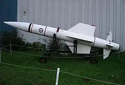 In 1952 the projects were split, with Bristol's effort becoming "Red Duster" and English Electric's becoming "Red Shoes".[2] These would fill the Stage 1 requirement, along with existing early warning radars and the Gloster Javelin interceptor aircraft. The original Red Heathen concept for a much longer-ranged weapon became "Green Sparkler" and then "Blue Envoy", and relegated to Stage 2 deployment in the 1960s along with newer radars and interceptor aircraft.