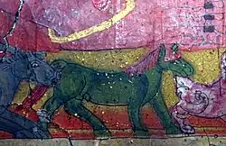 The support for wall paintings is made of earthen plaster, usually consisting of more than one layer of earthen plaster, in which the last layer is rendered as smoothly as possible. The support was covered by a smoothened ground, generally in white. Materials employed for the ground may be kaolin, chalk or gypsum, or any other white material deriving from an inert mineral.[3] To organise the painting, preliminary sketches were carried out. Generally, this involved the geometric layout of the design with the help of snapped lines and/or rulers.[4] Compasses were employed mainly for the construction of mandalas. Figures were roughly sketched, and then rendered with precise contours. These outlines are usually in black.[5] Repetitive designs were in some cases achieved with the use of stencils.[6]
