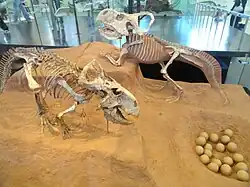 The early 20th century was a fruitful time for ceratopsian research. In 1907, Hatcher and others published a monograph on ceratopsid anatomy that is still considered the single most significant publication on the topic to date.[1] Many new species were being described, including Centrosaurus, Styracosaurus, and Chasmosaurus.[4] Not long after, the Central Asiatic Expedition led by Roy Chapman Andrews of the American Museum of Natural History discovered the primitive ceratopsians Psittacosaurus and Protoceratops in Mongolia. Protoceratops gained notoriety as the supposed parent of the first fossil dinosaur eggs known to science.[5] One of these supposed Protoceratops nests preserved the skeleton of a new kind of theropod dinosaur, Oviraptor. It was thought to have been preserved after being killed in the act of raiding the Protoceratops nest. This narrative would last until the 1990s, when the "Protoceratops" eggs were determined to belong to Oviraptor itself.[6]