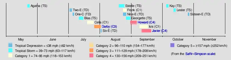 Prior to 2015, two time zones were utilized in the Eastern Pacific basin: Pacific east of 140°W, and Hawaii−Aleutian from 140°W to the International Date Line.[13][14] For convenience, each event is listed in Coordinated Universal Time (UTC) first, using the 24-hour clock (where 00:00 = midnight UTC),[15] with the respective local time included in parentheses. Figures for maximum sustained winds and position estimates are rounded to the nearest five units (knots, miles, or kilometers) and averaged over one minute, following National Hurricane Center practice. Direct wind observations are rounded to the nearest whole number. Atmospheric pressures are listed to the nearest millibar and nearest hundredth of an inch of mercury. This timeline documents the formation of tropical cyclones as well as the strengthening, weakening, landfalls, extratropical transitions, and dissipations during the season. It also includes information that was not released while the storm was active, meaning that data from post-storm reviews by the National Hurricane Center and the Central Pacific Hurricane Center is included.