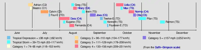 Hurricane OtisHurricane Norma (2023)Tropical Storm Max (2023)Hurricane Lidia (2023)Hurricane Jova (2023)Hurricane HilaryHurricane Dora (2023)Saffir–Simpson scale