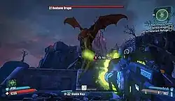 Assault on Dragon Keep is an expansion pack from the first-person shooter role-playing game, Borderlands 2.[4] It maintains the main game's science-fiction, looter shooter, and comedic elements,[5][6] while incorporating elements of tabletop role-playing,[7] including themes from Dungeons & Dragons, and, as a result, creates a concept that integrates fantasy gameplay within a first-person shooter experience.[6] The expansion pack's difficulty is best suited for players who are at least level thirty.[8]
