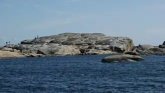 The landscape of the island is hilly. The highest point on the island is the 78-metre (256 ft) tall hill Herkelås. The bedrock forming the island consists of syenite, and the depressions on the island are covered by sand and clay. The shoreline can be rocky, but there are some beaches as well which draw significant numbers of summer tourists.[1]