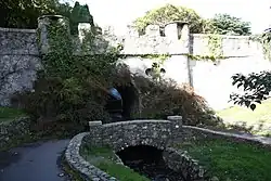 Tollymore features many follies whose design were influenced by Thomas Wright of Durham, a friend of James Hamilton, 1st Earl of Clanbrassil.[10] At the entrance and exit to the park there are Gothic gate arches built by James Hamilton, 2nd Earl of Clanbrassil (Viscount Limerick). The gate and gate lodge at the exit were built in 1786 and, along with the front walling, are grade B1 listed structures.[11] The barbican gate, also of Gothic design, is located on the main drive at the entrance to the park. It was built in 1780 and is a B+ listed building.[12]