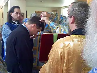 Clerical tonsure is the equivalent of the "first tonsure" in the Latin church. It is done immediately prior to ordination to the minor order of reader but is not repeated at subsequent ordinations.[14] This led to a once common usage that one was, for instance, "tonsured a reader", although technically the tonsure occurs prior to the prayer of ordination within the ordination rite.