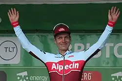 In August 2016, Martin signed a two-year contract with Team Katusha–Alpecin from the 2017 season.[82] In his first start with the team at the 2017 Volta a la Comunitat Valenciana, Martin took victory on the second stage with a 6-kilometre (3.7-mile) solo move.[83] He finished on the overall podium at the 2017 Tour of Belgium in third place, before winning the German National Time Trial Championships for the seventh time.[84] He finished eighth overall at the 2017 Tour of Britain, before finishing ninth in the time trial at the 2017 UCI Road World Championships – his worst placing in the event – having criticised the inclusion of an uphill finish on Fløyen.[85] Martin's lone victory of the 2018 season came with a seventh consecutive win in the German National Time Trial Championships.[86]