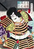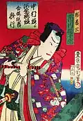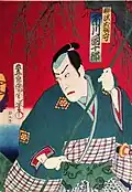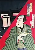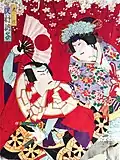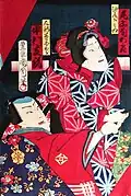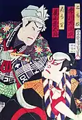Toyohara Kunichika (Japanese: 豊原 国周; 30 June 1835 – 1 July 1900) was a Japanese woodblock print artist. Talented as a child, at about thirteen he became a student of Tokyo's then-leading print maker, Utagawa Kunisada. His deep appreciation and knowledge of kabuki drama led to his production primarily of yakusha-e, which are woodblock prints of kabuki actors and scenes from popular plays of the time.