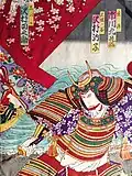Kunichika often portrayed beautiful women (bijinga), but his finest works are considered to have been bust, half- and three-quarter length, and close-up or "large-head" portraits of actors, and triptychs that presented "wide-screen" views of plays and popular stories.[14]