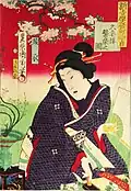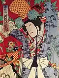Kunichika was described as having an open, friendly and sincere personality.[23] He enjoyed partying with the geishas and prostitutes of the Yoshiwara district, while consuming abundant amounts of alcohol. His greatest passion, however, was said to be the theater, where he was a backstage regular. His appearance said to be shabby. He was constantly in debt and often borrowed money from the kabuki actors he depicted so admiringly.[25] A contemporary said of him: "Print designing, theater and drinking were his life and for him that was enough."[26] A contemporary actor, Matsusuke IV, said that when visiting actors backstage for the purpose of sketching them, Kunichika would not socialize but would concentrate intensely on his work.[27]