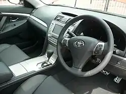 Aurion takes its doors, windows, roof panels, body sides (except front quarters) from the Camry XV40. However, the other panels are unique from the regular Camry.[26] This component sharing also means that Aurion has the same wheelbase, front and rear axle tracks, and interior dimensions. Interior design also largely parallels the Camry. Notable differences include the redesigned upper dashboard portion and restyled centre console, plus the substitution of the Australian Camry's hand-operated parking brake with a foot-operated equivalent (as shared with the Camry for Japan and North America).[27][28] The reasoning behind this component sharing strategy was to reduce costs and to allow the car to be built alongside the Camry, thus simplifying the manufacturing process.[29]