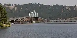![]() Crossing Lake Coeur d'Alene on the Chatcolet Bridge, a long wooden trestle bridge with a 1921-built, former-swing-span truss bridge section | |