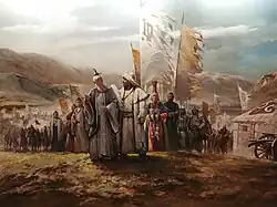 In 1220, on the invitation of Genghis Khan with a golden tablet, Qiu Chuji left his hometown in Shandong with nineteen disciples, and traveled north through Beijing. In June, they reached Dexing (德興; present-day Julu Hebei) and stayed in the Longyang Taoist Temple (龍陽觀) from summer to end of winter. On February 1221, they resumed their journey. When asked by friends and disciples when to expect the master to return, the master answered "In three years, three years". On February 3, they reached Cuiping Pass (翠帡口; west of Zhangjiakou), they saw the Taihang Mountains to their south. Travelling north then north east, they arrived at Gailipo salt lake (蓋里泊; now named Jiuliancheng Naoer 九連城淖爾; in the south of the Taibus Banner). From there they went to Lake Buir, Hulunbuir, Ulan Bator, Arkhangai, Altay Mountains, Beshbalik, Dzungaria, Samarkand and arrived at Hindu Kush of Afghanistan in 1222 and presented himself before Genghis Khan.