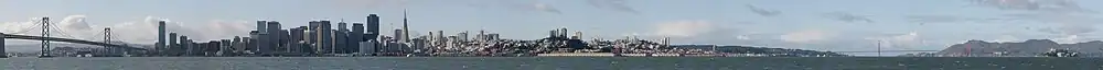 ![]() The western side of Treasure Island as seen from Yerba Buena Island. Faintly visible in the distance are the Richmond–San Rafael Bridge and Brickyard Cove. | |