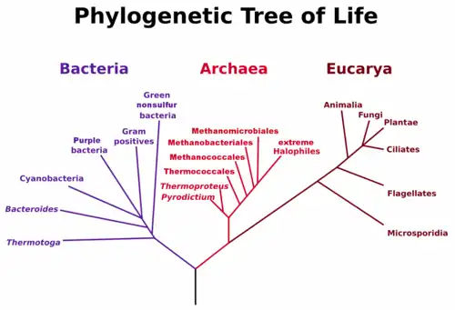 - ^ a b Woese, Carl R.; Kandler, Otto; Wheelis, Mark L. (1990). "Towards a natural system of organisms: proposal for the domains Archaea, Bacteria, and Eucarya". PNAS. 87 (12): 4576–4579. Bibcode:1990PNAS...87.4576W. doi:10.1073/pnas.87.12.4576. PMC 54159. PMID 2112744.