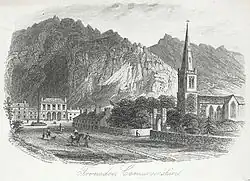 Tremadog was built on flat land reclaimed from Traeth Mawr, the estuary of the Afon Glaslyn, and to enhance its appearance Madocks placed the Market Square, the centre of his project, just in front of a great crag of rock, the former edge of the estuary. It towers some 100 feet (30 m) over the Town Hall, and the coaching inn,[3] giving a theatrical effect to the area. He hoped to attract more buildings that fitted his overall plan, but this plan failed and he eventually funded most of them himself.[4] The main streets were named Dublin Street and London Street, as Madocks wanted Tremadog to be a stopping-off point on the main route from London to Porth Dinllaen on the Llŷn Peninsula, which was intended to be the chief port for ferries to Dublin. However, this plan failed when Holyhead supplanted Porth Dinllaen as the main ferry port. He was keen that everything should enhance the village's appearance — his main interest. Unlike some contemporary town planners, he was less interested in the moral reform of the inhabitants: he felt that people had the right to work, educate their children, pray, drink, gamble, save or waste money as they saw fit; and that the town should give its residents opportunities to get on with their own lives, providing that they were congenial neighbours.[5]