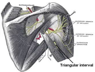 ![]() The scapular and circumflex arteries. (Triangular interval is visible but not labeled.) | |