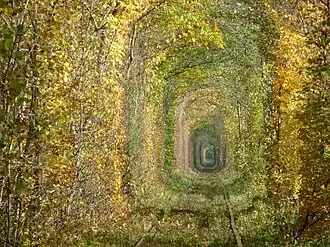 The Tunnel of Love (Ukrainian: Тунель Кохання, romanized: Tunel Kokhannia) is a section of industrial railway located near Klevan, Rivne Oblast, Ukraine, that links it with Orzhiv. It is a railway surrounded by green arches[1] and is three to five kilometers in length. It is known for being a favorite place for couples to take walks since trains pass thrice a day.[2]